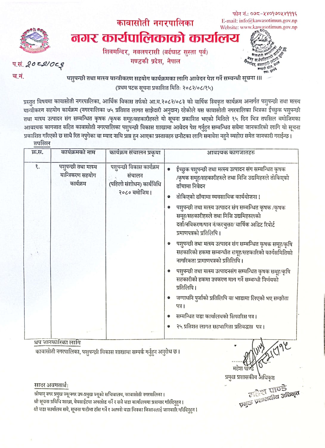 पशुपन्छी तथा मत्स्य यान्त्रिकरण सहयोग कार्यक्रमका लागि आवेदन पेश गर्ने सम्बन्धी सूचना !