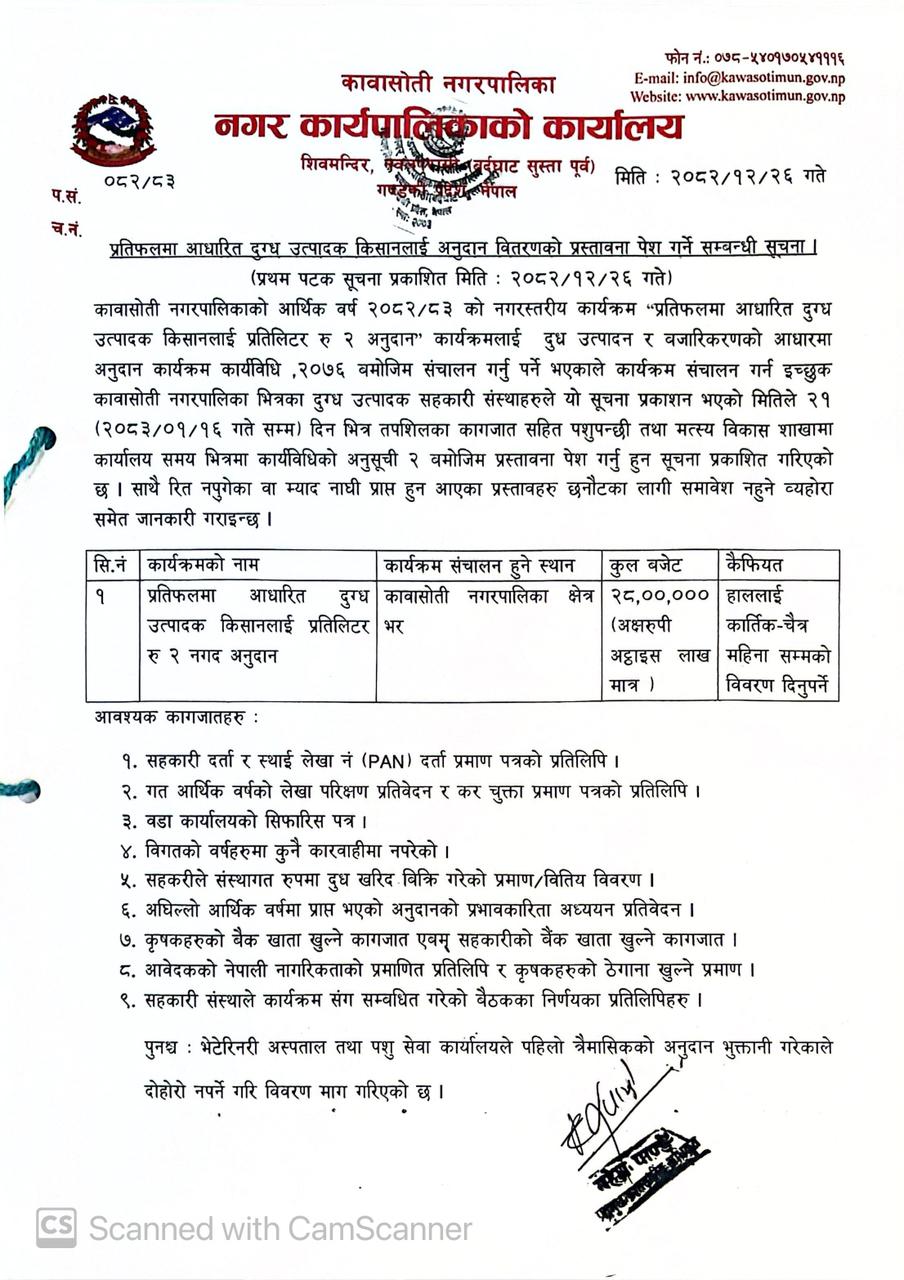 » प्रतिफलमा आधारित दुग्ध उत्पादक किसानलाई अनुदान वितरणको प्रस्ताव पेश गर्ने सम्बन्धी सूचना ।