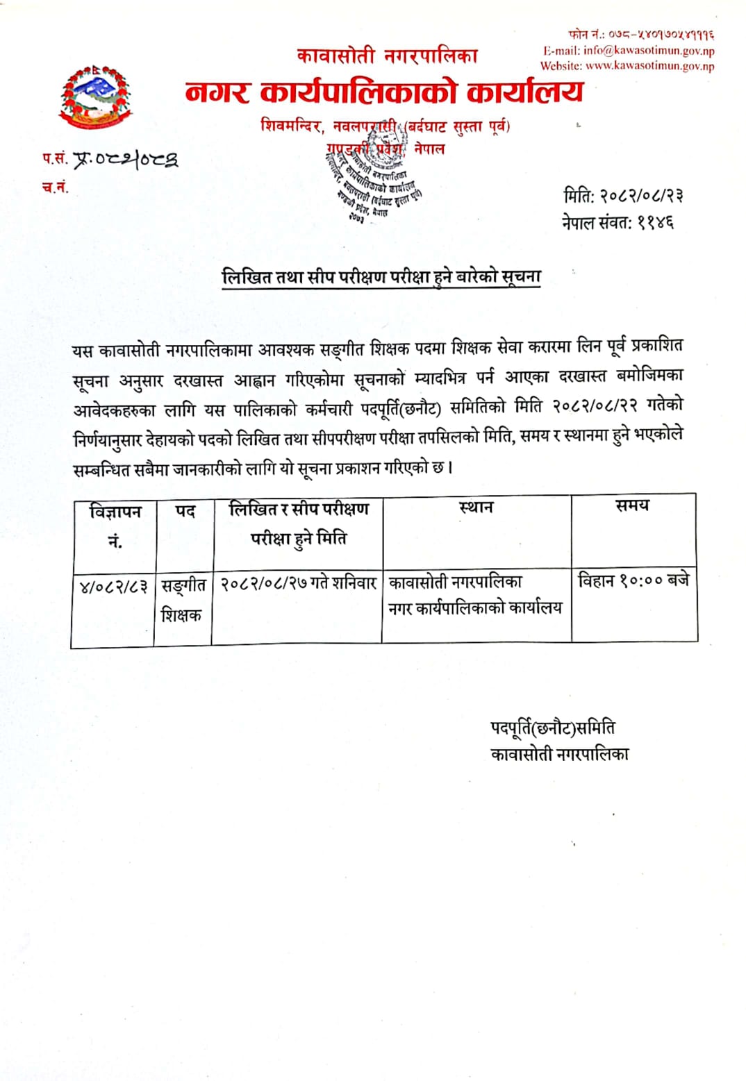 सङ्गीत शिक्षकको लिखित तथा सीप परिक्षण हुने सम्बन्धी सूचना !